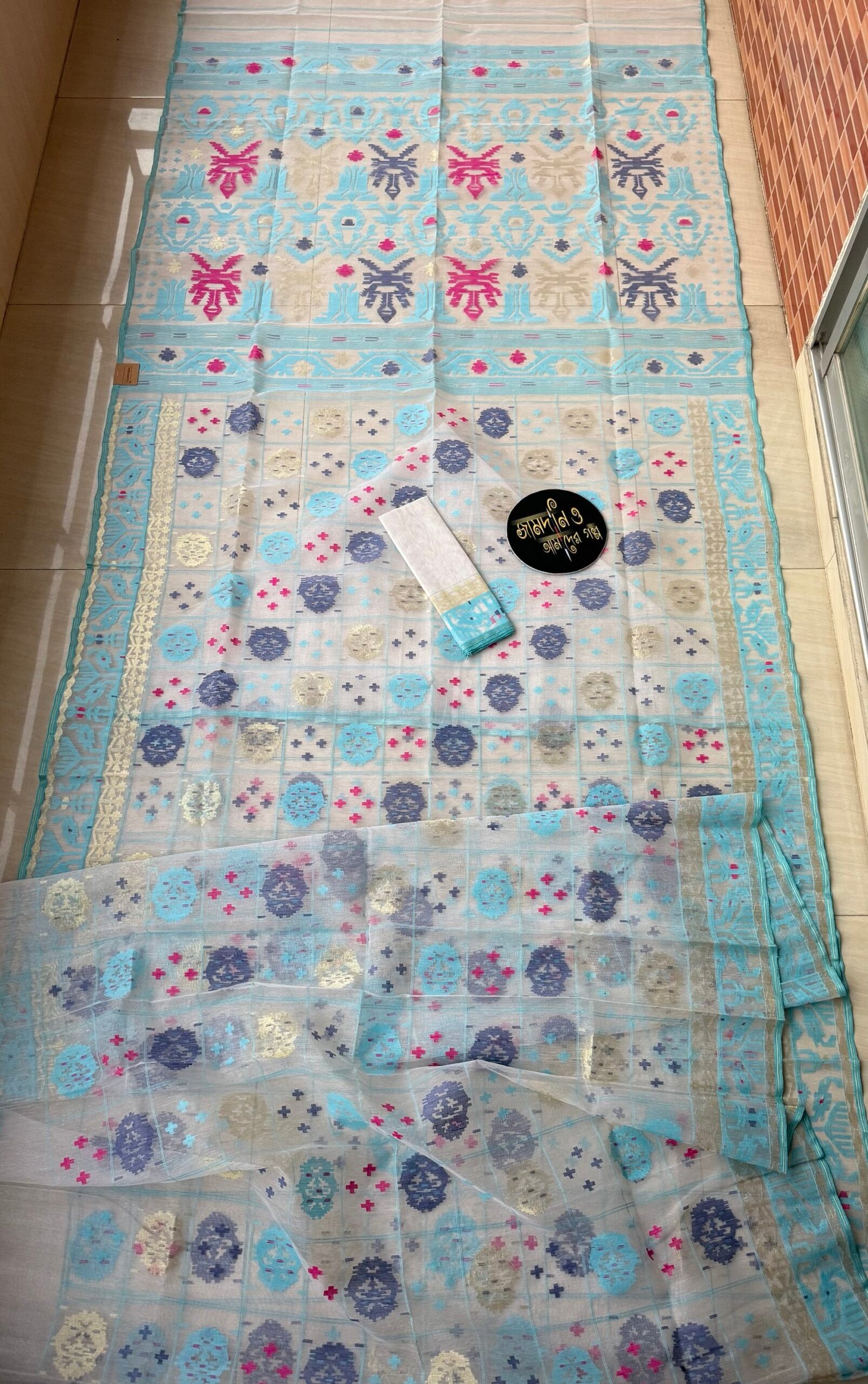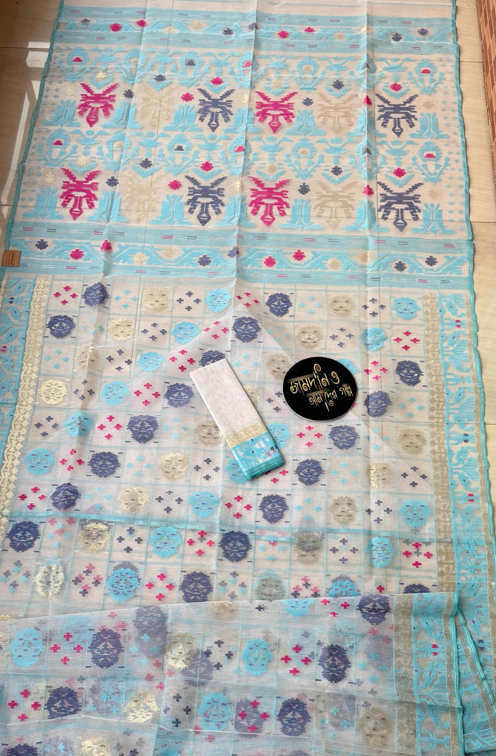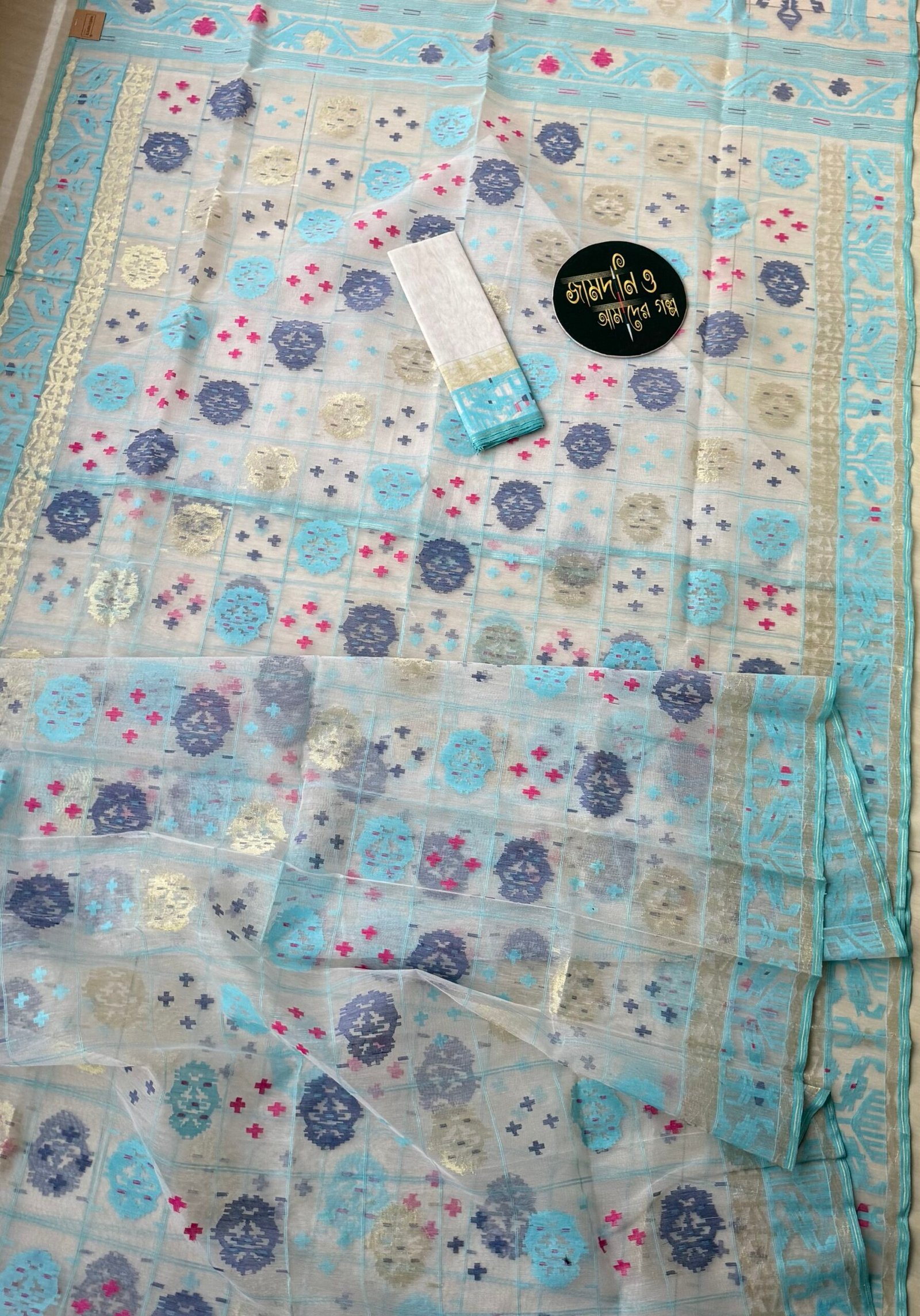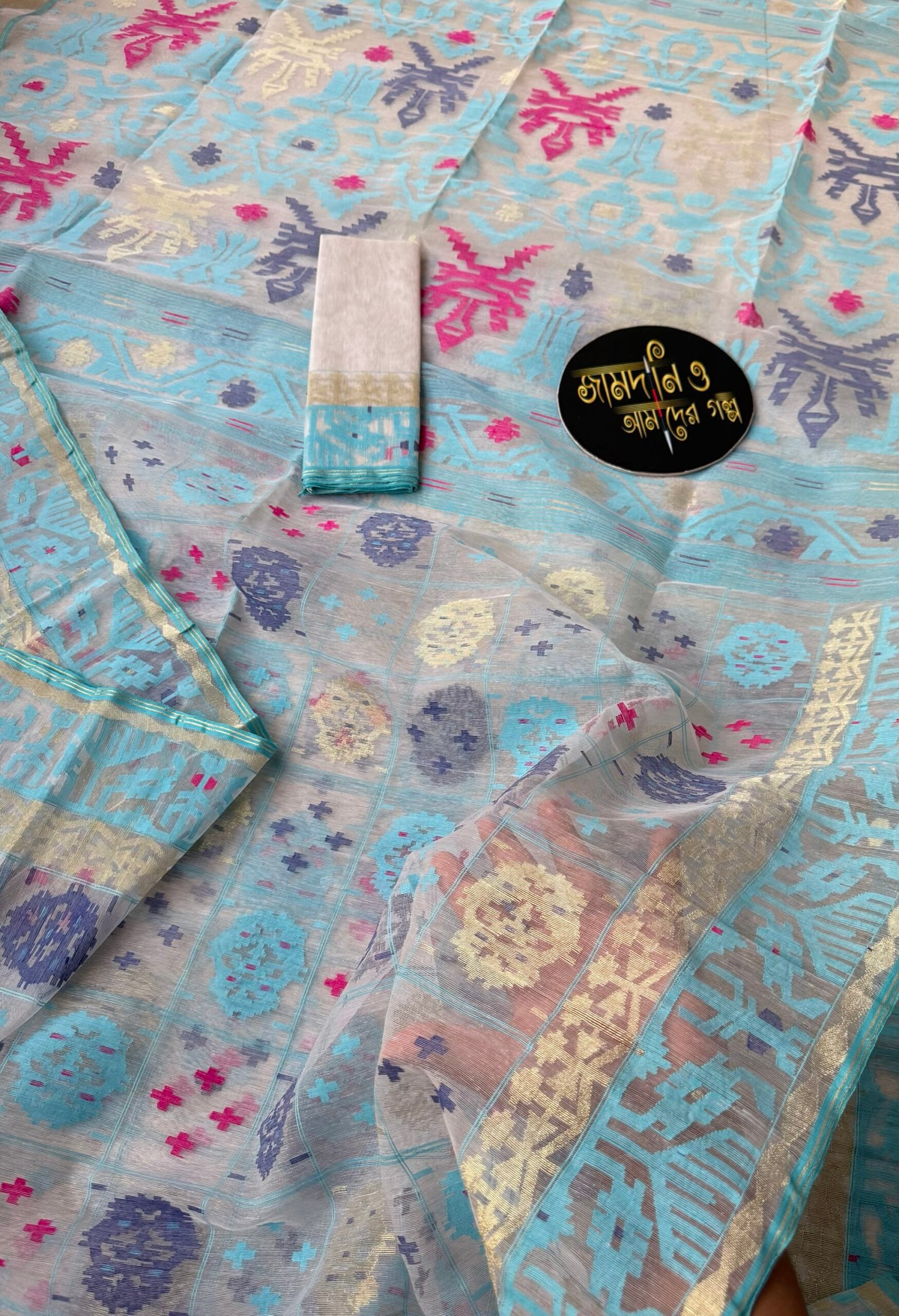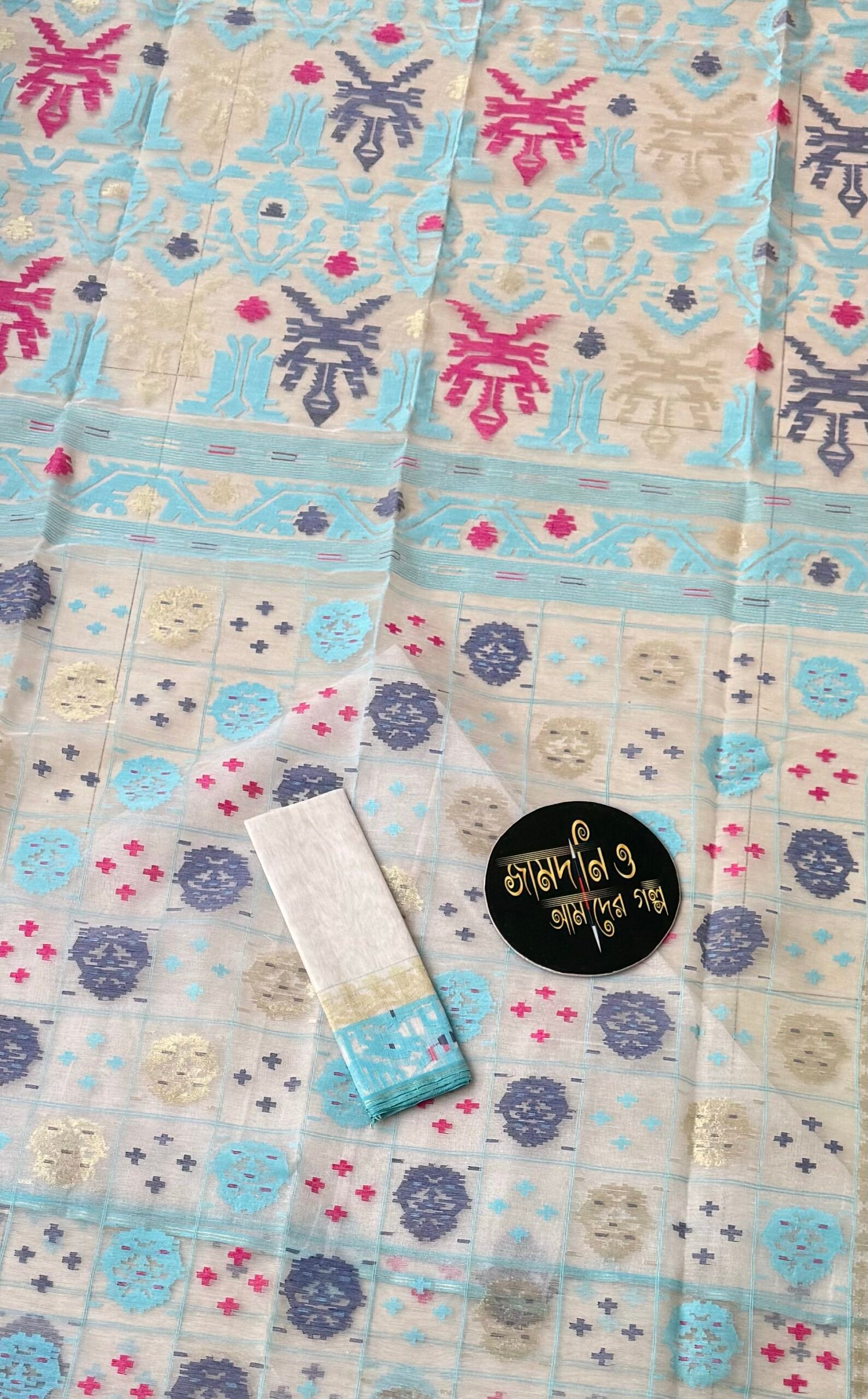 Color: Jamdani Saree Halfsilk White Sky Blue, Navy Blue, Magenta thread work and Golden jori work.